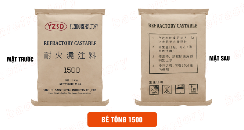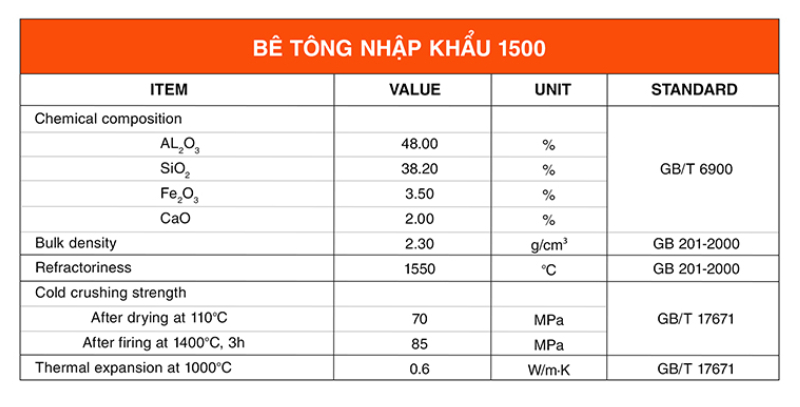 Sản phẩm bê tông 1500°C Trung Quốc với hàm lượng nhôm ô xit (Al₂O₃) khoảng 45%, có khả năng chịu nhiệt lên tới 1500°C và nhiệt độ làm việc tối đa 1300°C, đáp ứng đầy đủ yêu cầu cho các công trình đặc thù cần vật liệu chịu nhiệt cao.