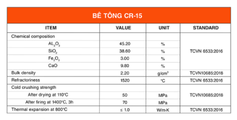 Các thành phần có trong bê tông đóng vai trò quan trọng, quyết định trực tiếp đến khả năng chịu nhiệt của sản phẩm, sự khác biệt này ảnh hưởng đáng kể đến hiệu suất và khả năng ứng dụng của từng dòng sản phẩm trong các môi trường nhiệt độ khác nhau. Dưới đây là các thông số kỹ thuật của dòng bê tông CR15 sản xuất tại Việt Nam: